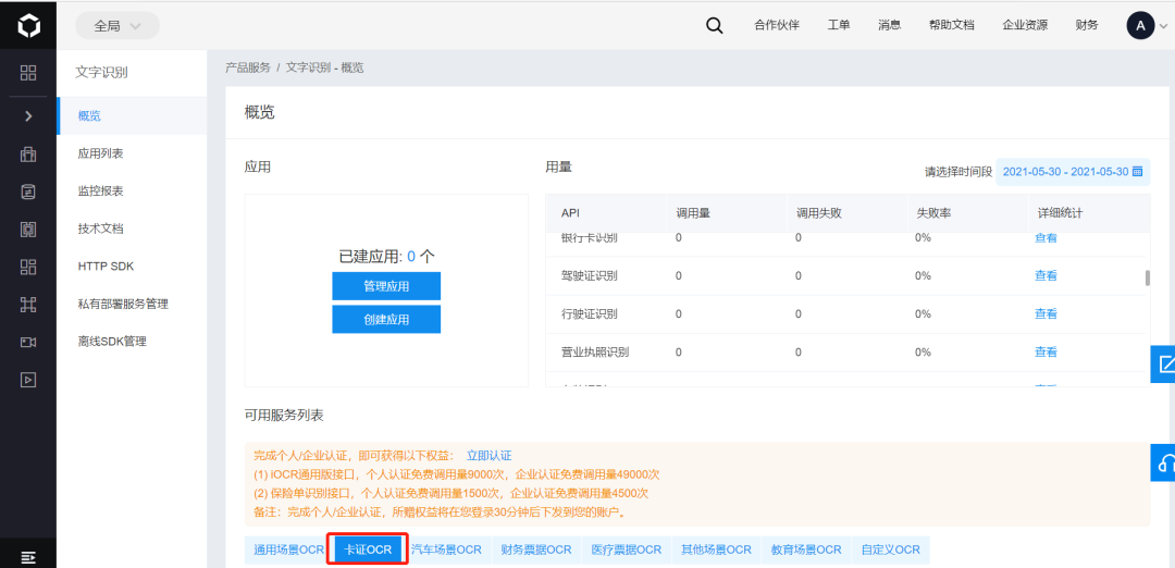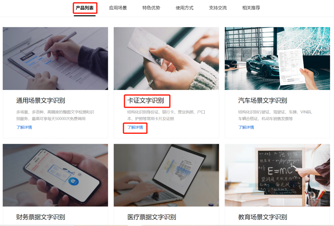 登录后找到文字识别中的产品列表,下方有卡证文字识别内容,点击了解详情。