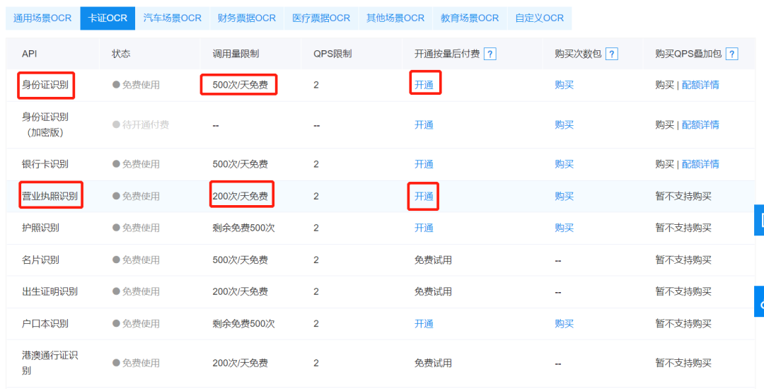 下滑后点击卡证OCR,就可以发现身份证别功能,点击开通按钮。
