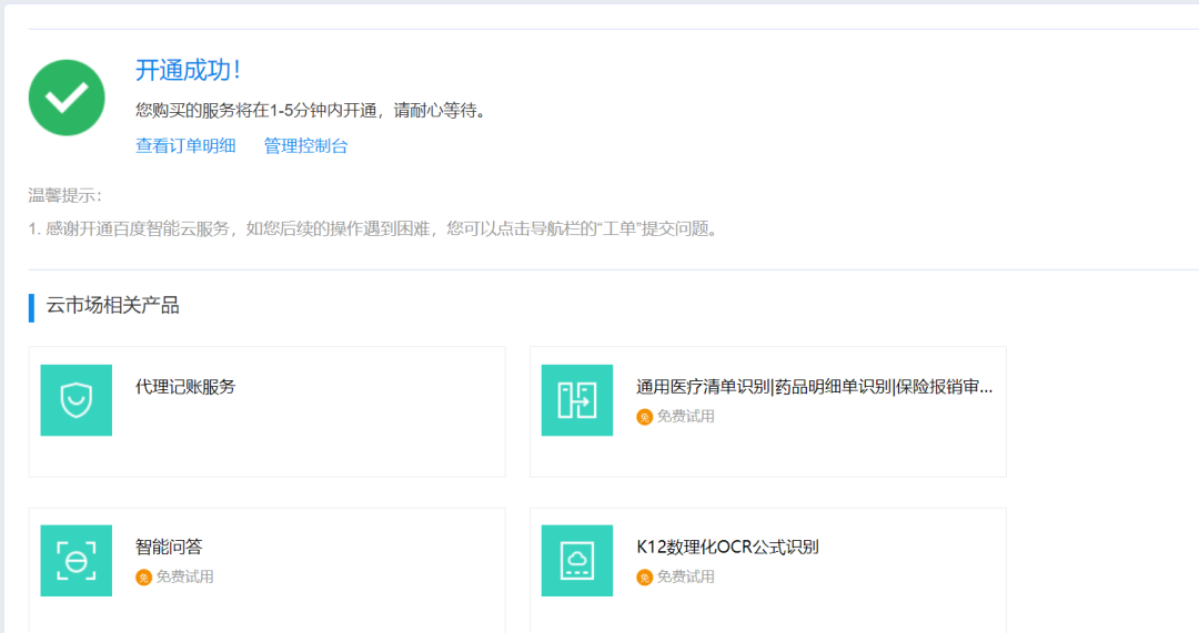 然后点击去支付,由于每天前多少次是免费的,且采取后付费模式,故不需提前付费。若开通成功,会出现如下界面: