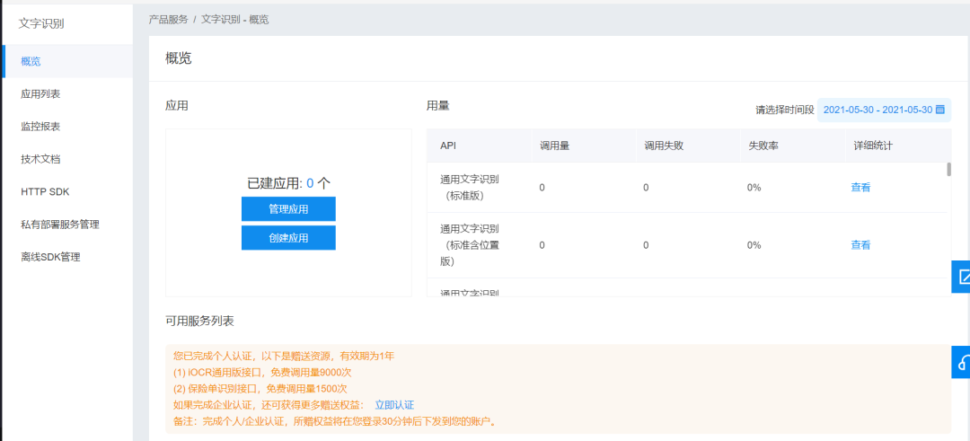 开通成功后,点击概览中的创建应用。