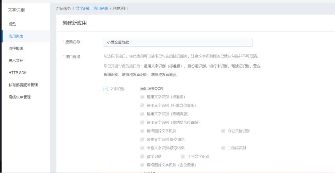 填写应用名称(自己想一个贴合自己应用场景的名字即可)、选择文字识别包名、选择应用归属、填写应用描述,点击立即创建即可。