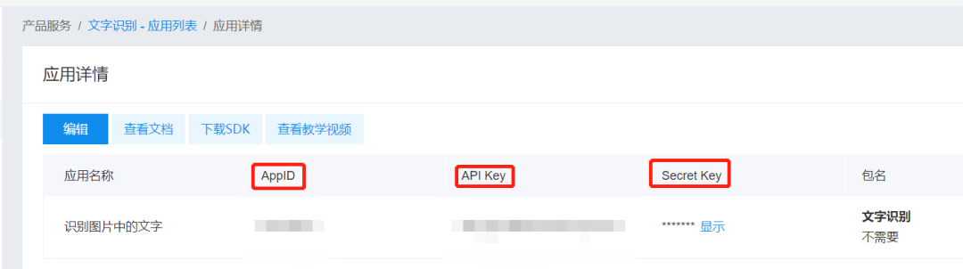 最后,点击应用详情,即可找到我们需要的接口密钥(红框对应的值)。
