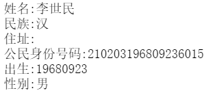 对比原始图片可以发现,出生是直接从身份证号码中截取的,住址的信息可能由于反光没有识别出来,结果为空。