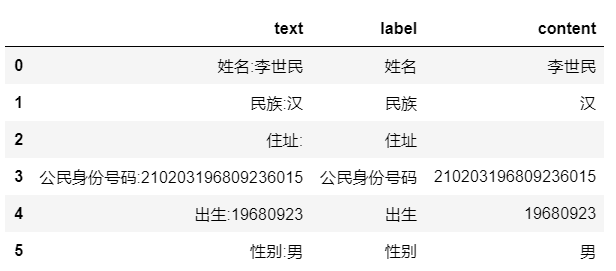 import pandas as pddate_concat_text = pd.DataFrame(concat_text)date_concat_text.columns =['text']df = date_concat_text["text"].str.split(':',expand=True)date_concat_text['label'] = df.iloc[:,0]date_concat_text['content'] = df.iloc[:,1]date_concat_text.to_csv("id_card_to_text.csv")