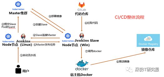 1~3:流水线每次触发,jenkins-master都会通过k8s启动一个jenkins-容器,