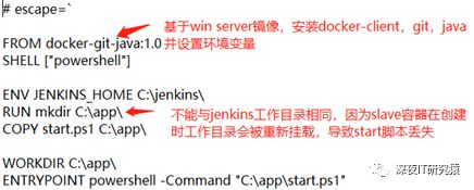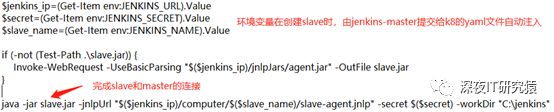 Dockerfile中的Start.ps1脚本,用来获取slave容器中的环境变量(前面提到过:环境变量由jenkins-mater提交的yaml文件注入),并执行java -jar这一条命令,完成和jenkins-master的连接。脚本内容如下: