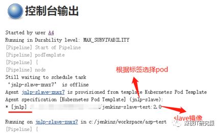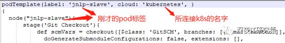 Jenkinsfile中根据cloud参数选择要连接的k8s,根据label参数启动对应jenkins-slave容器跑完整个流水线。