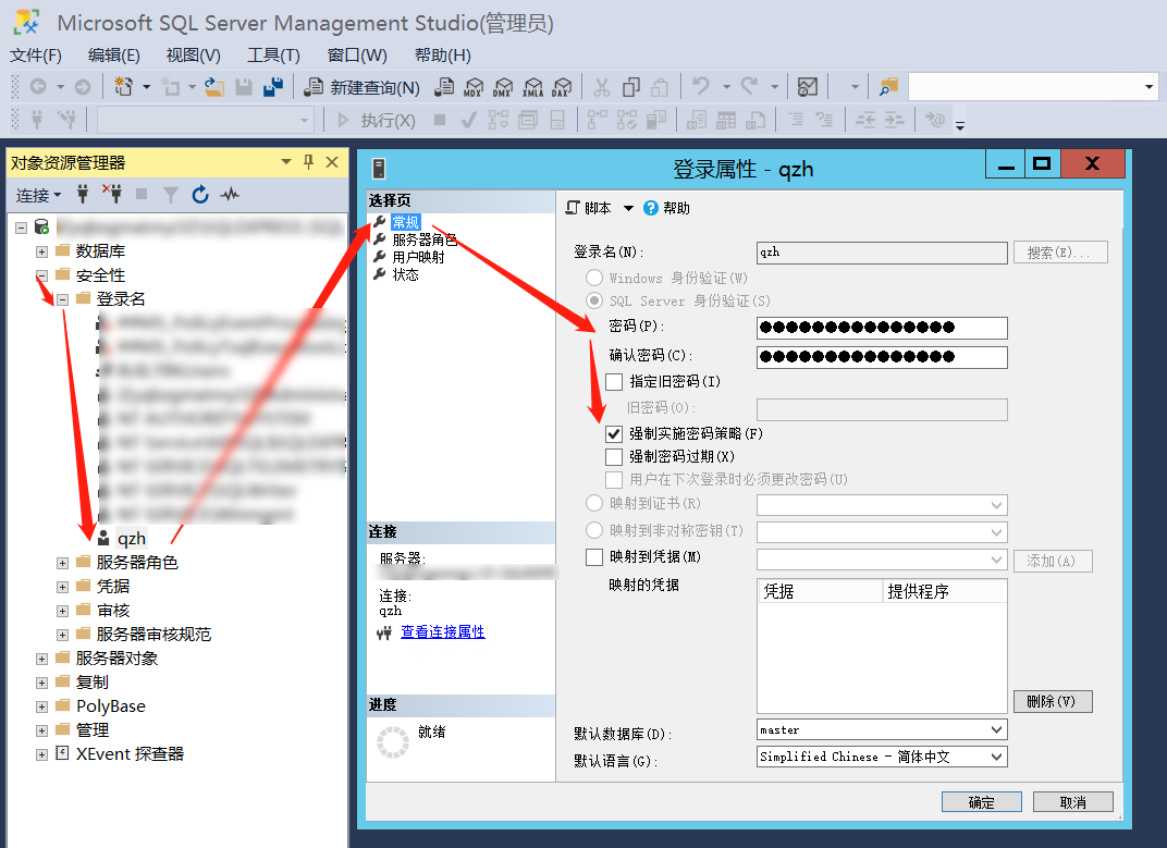 在服务器环境,打开Microsoft SQL Server Management Studio(SSMS),按下图操作配置SQL Server登录账号(登录名右键-属性,打开登录属性设置窗口),在常规页内设置好登录名、密码,选择强制实施密码策略