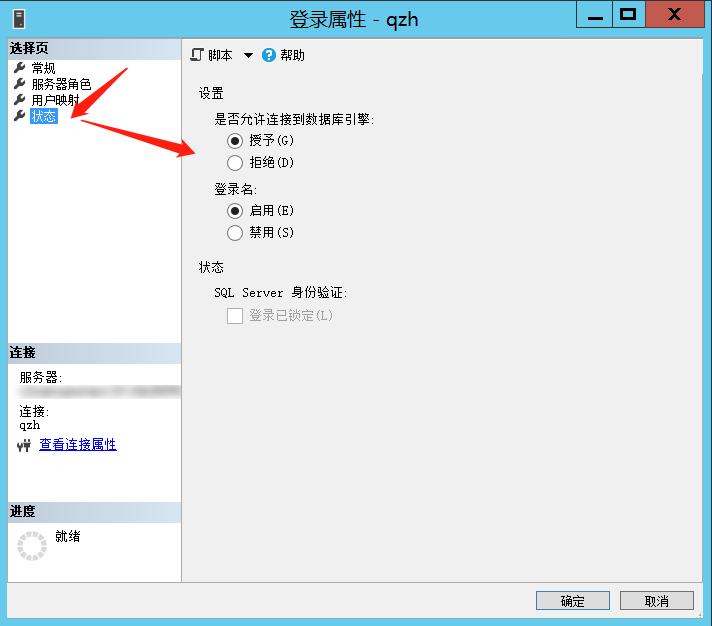 此窗口的状态页设置为下图所示:允许连接到数据库,启用登录名,然后最下方确定