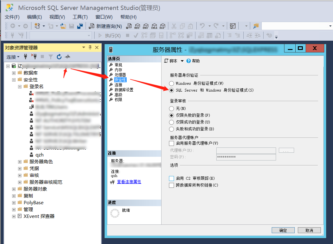 左侧对象资源管理器对服务器右键-属性,打开服务器属性窗口,选择安全性,身份验证模式选SQL Server和Windows身份验证模式