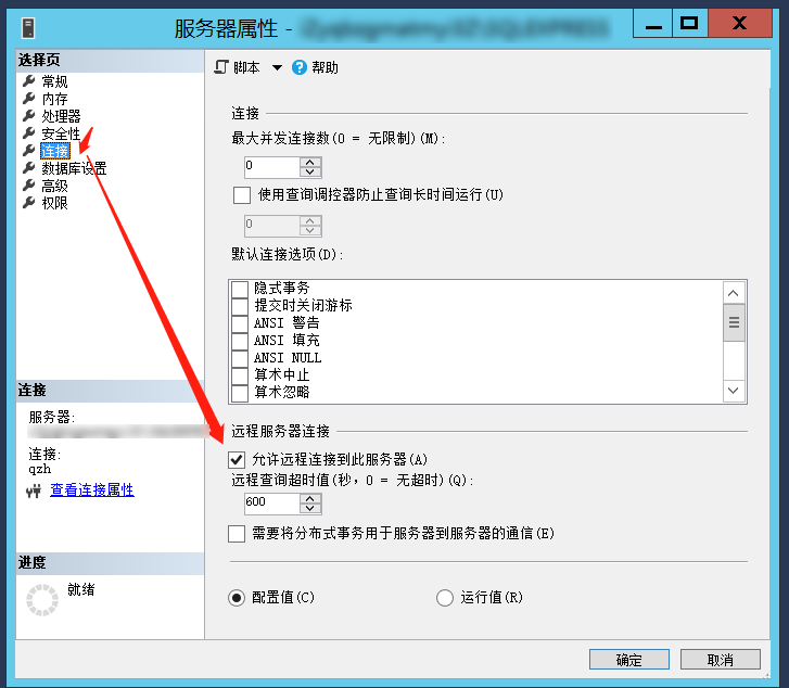此窗口再选择连接页面,勾选允许远程连接到此服务器,最下方确定