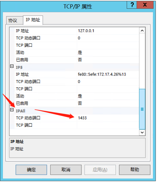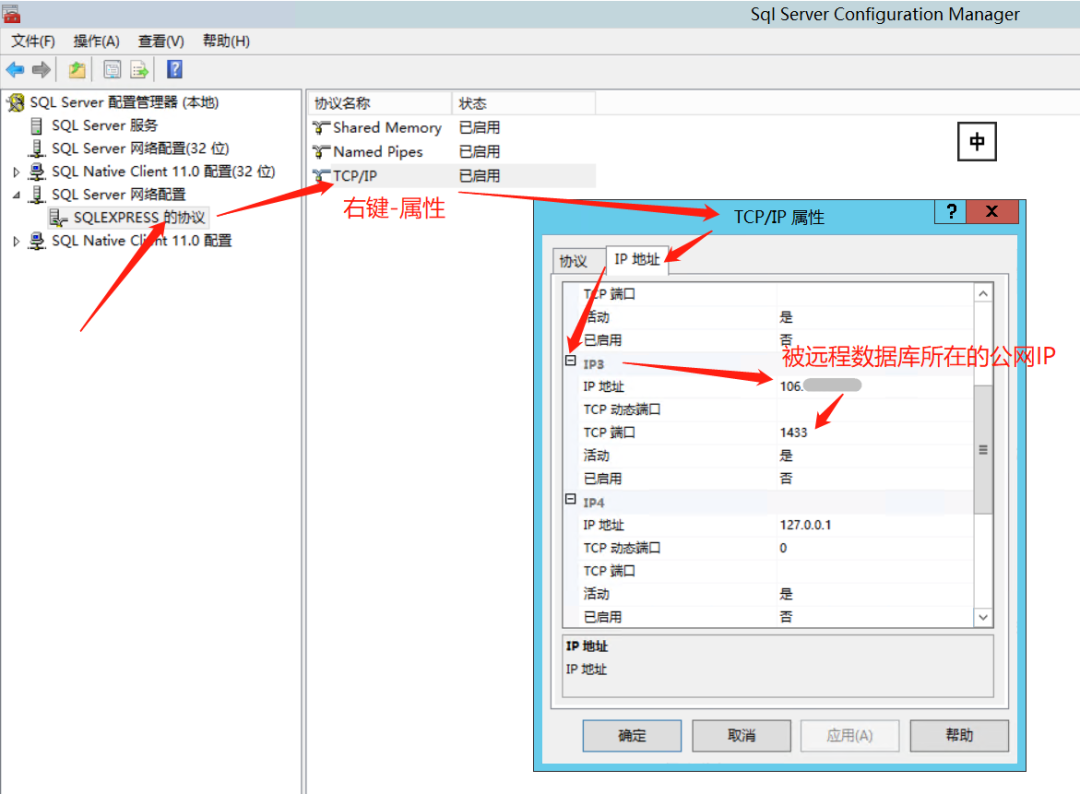 按下图所示配置:TCP/IP状态启用,TCP/IP属性窗口:①IP3:IP地址设置为当前服务器的公网地址,TCP动态端口清空,TCP端口设置为1433(SQL Server默认的TCP/IP端口是1433),②IPALL:TCP动态端口设为1433。最下方应用并确定