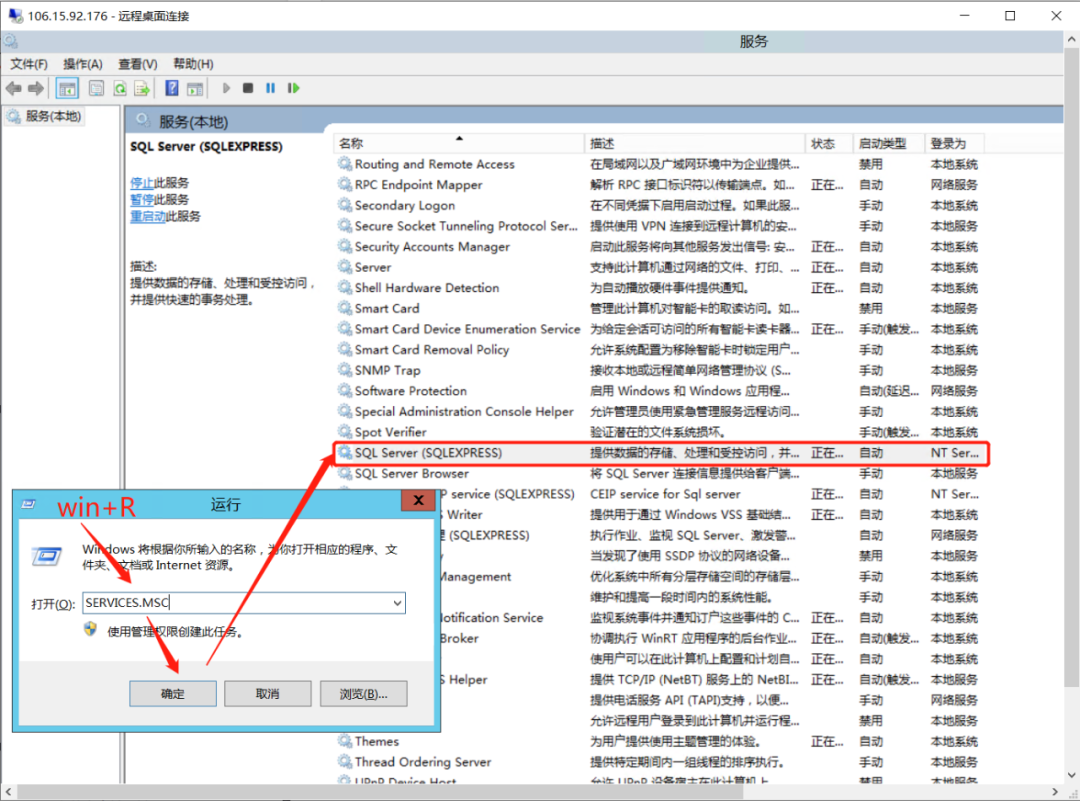 最后WIN+R打开运行,输入services.msc进入服务窗口,确保SQL Server(SQLEXPRESS)的状态为运行(如果上一步的设置需重启服务后生效,也可在此窗口将服务重新启动)