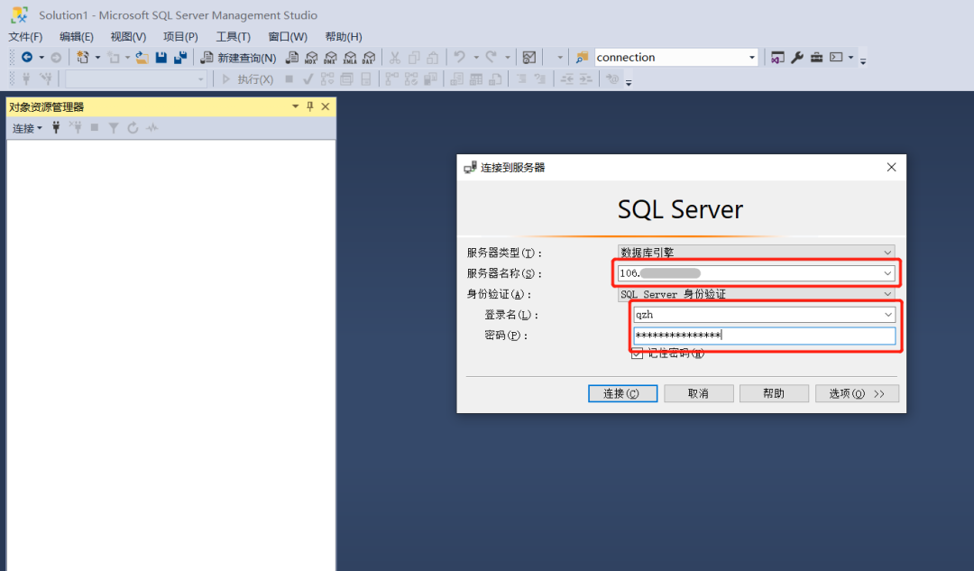 在发起连接的本地环境,打开Microsoft SQL Server Management Studio(SSMS),连接窗口的服务器名称填服务器的公网IP,登录名和密码填入在第一步已设置好的登录名、密码,点击连接即实现远程连接数据库