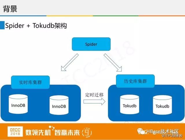 以上这个架构主要运用了MySQL的一些组件,包括三种引擎,左边是实时库集群,这个集群使用的是InnoDB引擎,集群中的设备性能很好,IO能力强,内存大,CPU也很好,里面有几百套的分组,因为微信支付的交易很复杂,涉及到分布式事务、同城容灾、跨城容灾等等很多方面。当时我们使用的是MySQL和InnoDB数据库,使用过程中发现只要出现一个节日,我们线上的容量就会不够,因为高性能的服务器容量是有限的。