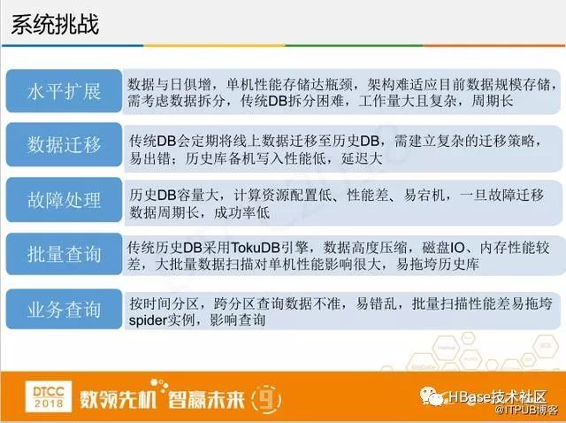 我们遇到的挑战主要是上图的几个方面,第一个水平扩展,因为国家要求金融机构保存交易数据,随着交易数据与日俱增,单机性能存储很容易达到瓶颈,架构难以适应目前数据存储规模,需要考虑数据拆分,但传统DB拆分困难,工作量很大周期又长。