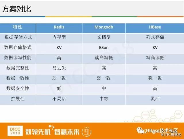 我们当时解决方案就是对比数据库来选择性能更好的数据库,我们对比了Redis、MongoDB还有 HBase,但最终选择了HBase,主要是看中了它写高读低的特点,这个对我们其实影响不大,我们对历史数据的查询比较少,也没有像对在线交易业务的要求那么高。第二是它的扩展性灵活,只要HBase的集群稳定,它的扩容就非常容易,HBase的安全性也高,这样团队需要做的事情就少了很多,我们可以有更多的精力放在其他方面的工作。