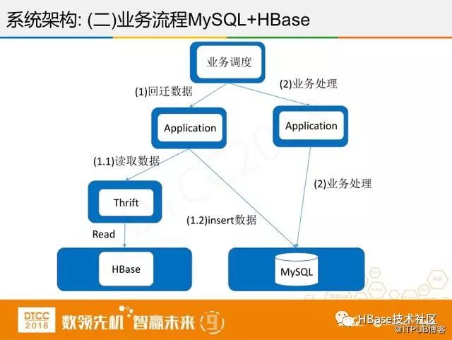 对于业务流程该如何使用呢?我们不仅仅把HBase当做存历史数据的平台,业务流程除开账务DB外,还有其他交易相关的DB,它们都有同一个问题,容量很容易爆满,为了将HBase发挥更大的用处,在特定的场景下,比如一个月前的历史退款,线上数据不可能保存这么久,如果时间有一个月以上的退款,我们从HBase查退款,将其写入MySQL,核心的退款流程和金融流程直接在MySQL做,这样一来对业务的改动最小,方便业务操作。