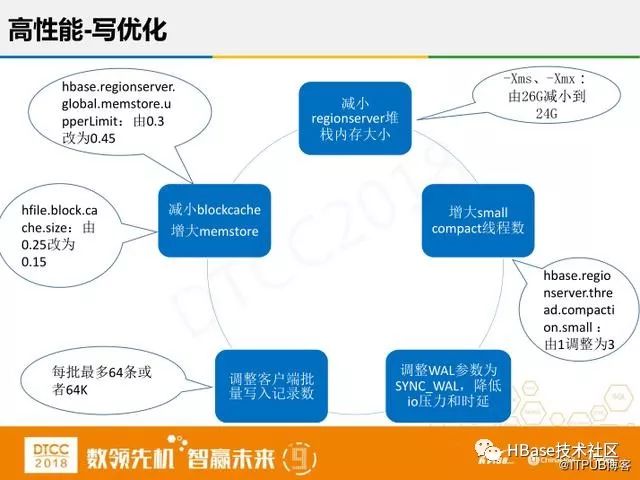 HBase的写入原理是基于LSM思想,先把数据写入内存之后返回,通过异步方式再落盘,但是这样在磁盘就有很多小文件,查询的性能就会非常差。所以,还需要将磁盘上的小文件compaction,减少文件个数。考虑之前积压的很多compaction任务,我们把small compact线程条加大。再一个是调整WAL日志的参数,做过关系型数据库的人可能清楚,HBase里有四种方式,第一种是直接写内存不写硬盘,第二种是异步的落盘,第三种就是写入操作系统不落盘,第四种是实时写盘。结合性能与数据可靠性,我们采用写入操作系统不落盘的方式,考虑有三个副本同时出现三连级故障的可能性比较低,降低IO压力和时延。再有就是减小regionserver堆栈内存大小,因为我们业务写入量实在太频繁,而cache查询命中率真非常低,大概只有10%到15%,所以我们将内存全部分给写入,来提高写入的量。因为是批量写入型业务,我们可以根据需求调整客户端批量写入记录数来提高写的性能。