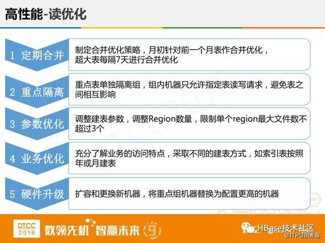 之后是读的优化,我们用的服务器硬件很差,运作率很低,所有的查询基本全靠磁盘的IO硬能力去抗。LSM思想有个缺点,就是文件数太多影响查询性能,假如要查询rowkey=100的数据,文件数有100个,由于每个文件里可能都有rowkey=100的记录,那么我们就要扫描100个文件,耗费时间很长。我们的解决方法是减少在region下的文件数,定期合并文件,把小文件整合成大文件。第二个就是重点隔离,我们把一些表单独隔离,做一个组,去减小耦合,而且组内机器只允许制定表读写请求,避免不同表之间的相互影响。还有参数优化,我们一开始建了很多region表,这样对整个集群压力太大,所以就减少小表,控制其数量。再有一个就是业务按照优先级分等级,不同的级别的业务不同处理,有些索引表可以按年建,有些表可以按月建。最后是硬件升级,重点组配置更高性能的服务器。