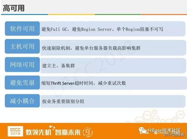 在高可用方面,第一个HBase本身必须保证可用,这是最基础的点,避免Full GC,避免Region Server单个Region阻塞不可用。第二当机器出现故障,怎么做才不会影响整个集群的读写?我们使用快速剔除机制,避免单台服务器负载高影响集群,第三考虑网络不可用、机房故障情况,为此建立主、备集群,一个集群里有三个副本,那么就共有六个副本,成本很高,我们考虑隔三个月时间就减少到两个副本,以此来节约成本。第四避免雪崩,无论是Thrift Server还是RPC的调用,操作时间都是比较长的, 这就需要缩短Thrift Server超时时间,减少重试次数。最后按业务重要级别分组,减少和其他机器的耦合。