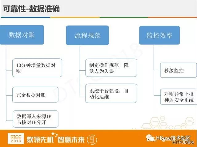我们通过三种方法来保证数据的准确性,第一种是数据对账,在金融系统中都会有数据对账,我相信无论什么系统都会有bug,对账十分关键不能出错,我们有10分钟增量对账,有冗余数据对账,要求数据写入来源IP与核对IP分开,来源DB于对账DB分开。第二个从流程规范来降低人为失误,通过一些系统化的方法来运维。第三个是提高监控效率,加了秒级监控,如果出现问题能快速发现马上解决,出现对账异常立刻上报神盾安全系统。这样通过上面的三种方法,我们把数据的准确性提高了一个量级。