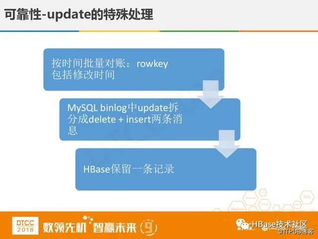 这里单独讲下update的特殊处理,金融业务对数据的处理分两种,第一种是直接映射的,像用户资金流失这种比较简单。比较困难的是第二种时间批量对账,比如像一些余额和某些订单的状态,我们一天的数据量有几百亿,该如何应对平均一秒几十万的对账呢,为此系统加了修改时间,使得对账更加准确,但同时会造成数据的冗余,比如一个单号对应我们交易系统里的一条记录,但在HBase中没有update,全部是映射,这样就会有两条记录,这样状态下退款是不能成功的,为解决这个问题,我们将MySQL binlog中update拆分成delete + insert两条消息,使得HBase中保留一条记录。