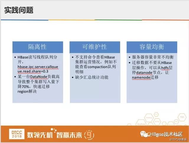 我们在实际运用HBase过程中,也遇到了很多其他问题。第一个是遇到HBase读写线程队列分开,因为我们写入量远远多于读的量,比如退款业务只有写没有读,我们调整了hbase.ipc.server.callqueue.read.share=0.3的参数,来保证一定的读写线程。还遇到某一台DataNode负载高导致整个集群写入量下降非常明显,我们增加了秒级监控可以快速发现,快速迁移region解决。