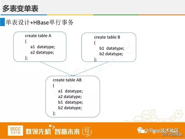 那如何来解决事务问题呢?第一个,HBase虽然不支持跨行跨表事务,但可以多表变单表,实施单表设计与HBase单行事务。所以在处理数据表的事务时,尽量多表换单表,避免分布式事务。