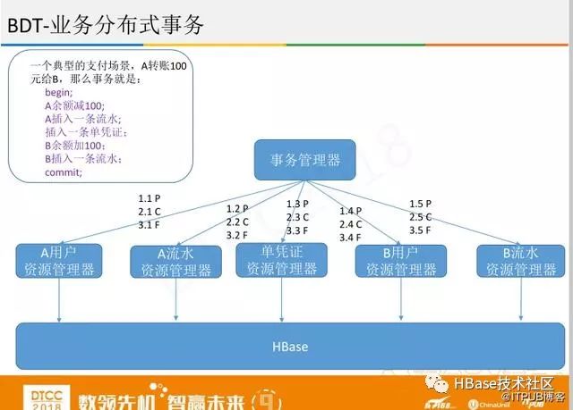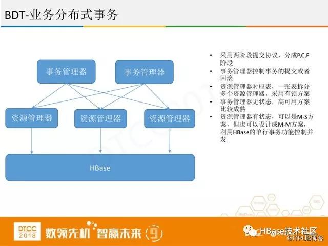 第二个事务是业务分布式事务,如果做金融业务,在HBase中改动难度太大,可以在业务层进行改动,采用两阶段提交协议,分成P,C,F阶段。事务管理器控制事务的提交或者回滚。资源管理器对应表,一张表拆分多个资源管理器,采用有锁方案。事务管理器无状态,高可用方案比较成熟。资源管理器有状态,可以是M-S方案,但也可以设计成M-M方案,无论是分布式还是单机,把HBase进行重组,利用HBase的单行事务功能来控制并发。