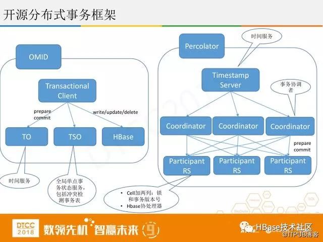 第三个是开源分布式事务框架。主要是两种OMID和Percolator,共同点是两阶段分布式。不同点是OMID有个全局事务,通过它来控制并发,控制哪个事务该回滚。Percolator主要是运用Hbase协处理器的技术,实践起来比较困难。
