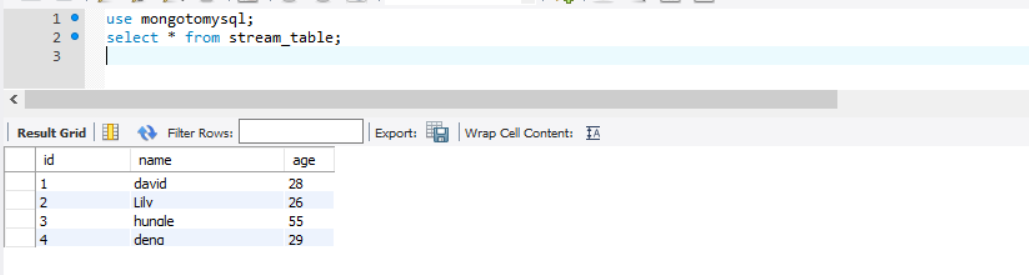 同样,在MySQL的mongotomysql库下也有stream_table表,字段为id、name、age。需要将MongoDB的stream_table集合数据迁移到MySQL的stream_table表。