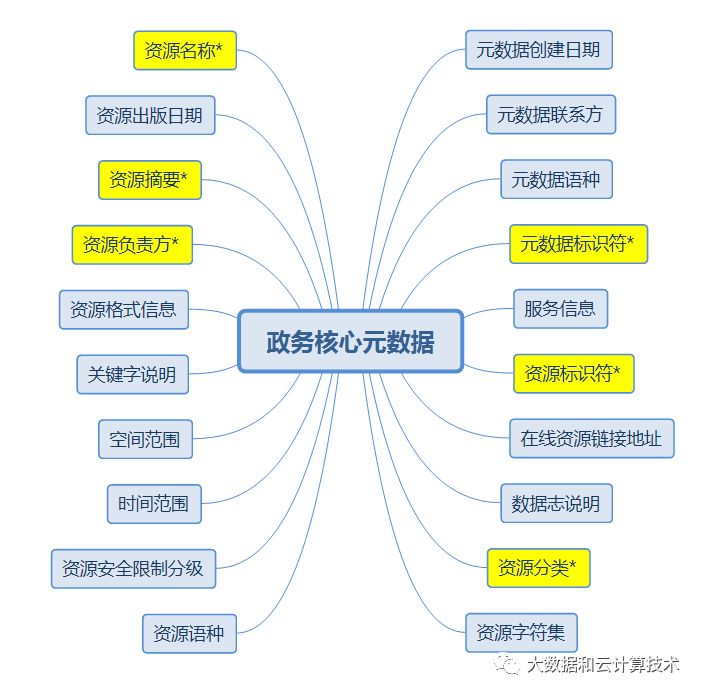 作为“数据的数据”(data about data),政务元数据服务于政务大数据的采集、标准化、规范化和数据交换。提到元数据,不得不提OMG(Object Management Group)的 CWM(Common Warehouse Metamodel ),即通用数据仓库元模型。CWM定义了元数据的规范、标准,覆盖了关系型、非关系型和多维数据,以及在数据仓库环境之下的其他数据对象。作为基于传统数据仓库理论的元数据定义,在大数据的应用情景下依然适用。在大数据的应用场景下,元数据也依然是重要的标准化组成部件。按照元数据的用途,可分为技术元数据(用于开发和日常管理如控制)和业务元数据(关键业务价值、业务上下文)。前者是运作保障,后者是实质内容。元数据尤其是技术元数据的标准化、规范化程度(数据标准、映射关系和规则)决定了数据的质量,元数据尤其是业务元数据的规划设计水平决定了数据的价值。就政务大数据而言,其技术元数据支撑着政务应用体系的开发规范和控制模型,业务元数据支撑着政务大数据的核心价值实现(服务于公民、企业、外国人和其他社会组织)。依据《政务信息资源目录体系 第3部分:核心元数据》标准,核心元数据内容有20项(其中,必选项有6项)。如下图所示(加*的为必选项):