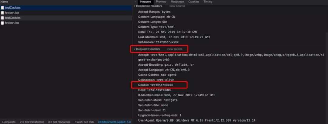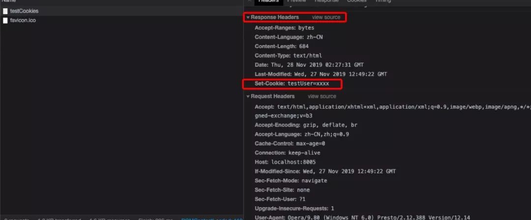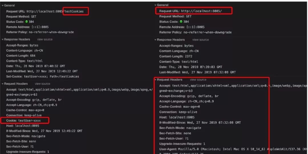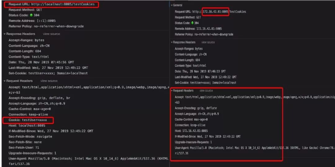 我们发现下图中左边的是有 Cookie 的字段的,但是我们访问 http://172.16.42.81:8005/testCookies,看下图的右边可以看到没有 Cookie 的字段了。这就是 Domain 控制的域名发送 Cookie。