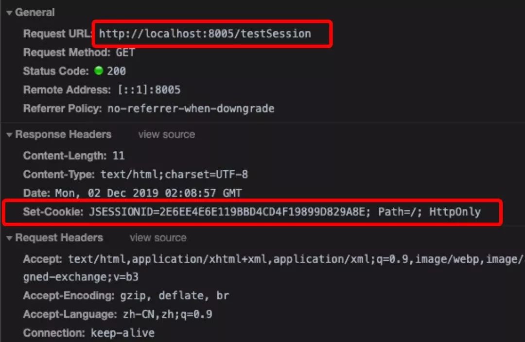 然后在浏览器中输入 http://localhost:8005/testSession 进行访问可以看到在服务器的返回头中在 Cookie 中生成了一个 SessionId。