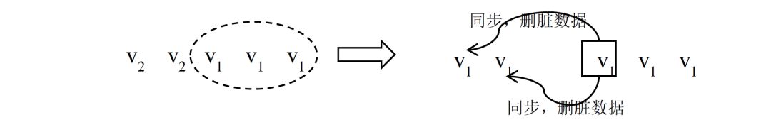 第一、如图 2-12,若中心节点与其中3 个副本通信成功,读取到的版本号为(v1 v1 v1),则任 选一个副本作为primary,新primary 以v1 作为最新的成功提交的版本并与其他副本同步,当与第1、第2 个副本同步数据时,由于第1、第2 个副本版本号大于primary,属于脏数据,可以按照2.2.2.4 节中介绍的处理脏数据的方式解决。实践中,新primary 也有可能与后两个副本完成同步后就提供数据服务,随后自身版本号也更新到v2,如果系统不能保证之后的v2 与之前的v2 完全一样,则新 primary 在与第1、2 个副本同步数据时不但要比较数据版本号还需要比较更新操作的具体内容是否一样。