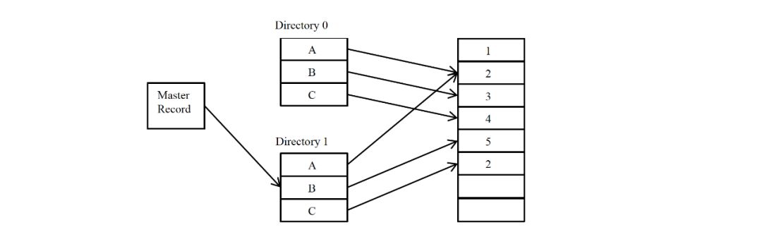 0/1 目录技术中有两个目录结构,称为目录0(Directory 0)和目录1(Directory 1)。另有一个结构称为主记录(Master record)记录当前正在使用的目录称为活动目录。主记录中要么记录使用目录0,要么记录使用目录1。目录0 或目录1 中记录了各个数据的在日志文件中的位置。0/1 目录的数据更新过程始终在非活动目录上进行,只是在数据生效前,将主记录中的0、1 值反转,从而切换主记录。