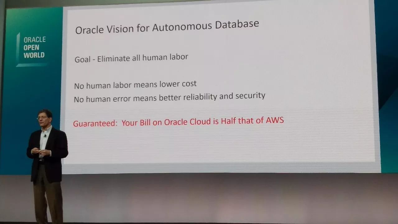 当然,在这一页PPT讲稿中,还特别标注了10月1日晚Larry Ellision提出的赌注,你的云上账单,Oracle至少比AWS便宜一半。当晚Larry在讲到这一比较时还玩笑的对着台下的Mark Hurd等人说:你们最好没有算错!