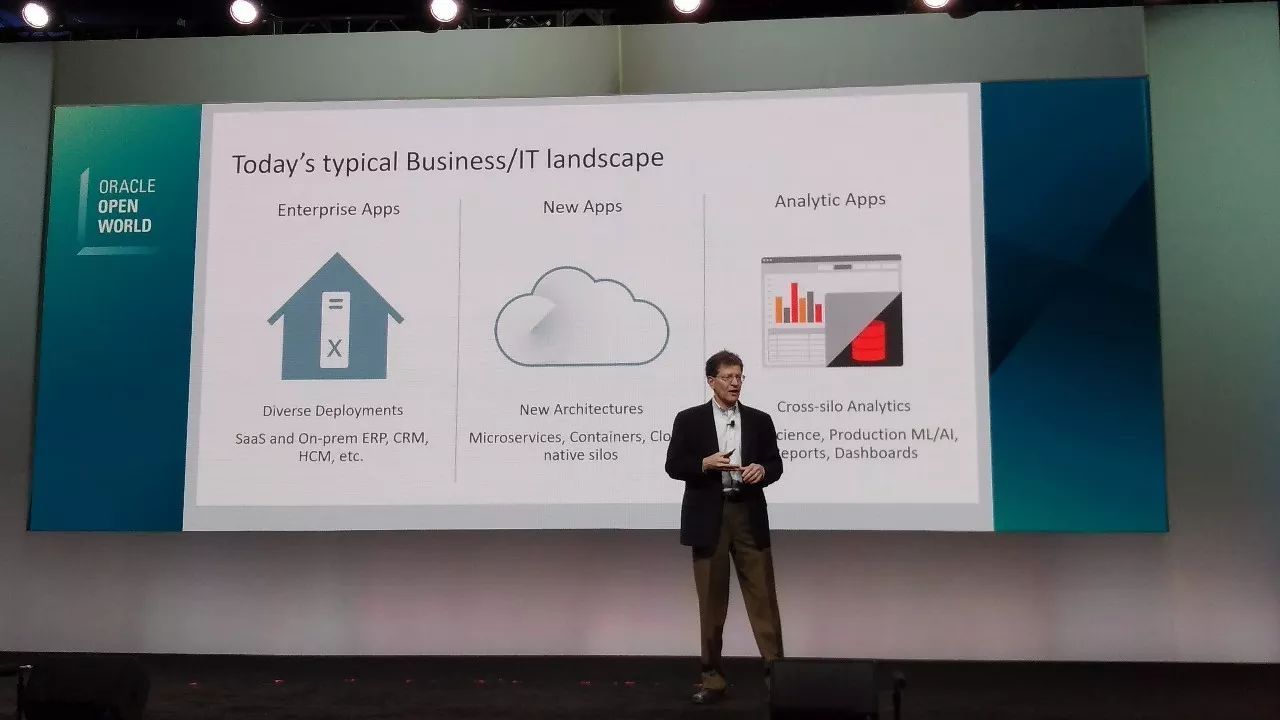 今天企业典型的IT格局就是,传统多样混杂的部署,包括企业级应用和云上的SaaS环境,而新的应用则是微服务、容器化;而分析型APP则是跨应用,跨领域进行分析。