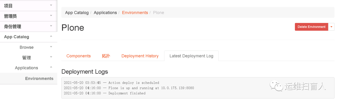 root@controller:~# openstack environment deploy --session-id a6ace79f29b84afeb629a12d9f084ab9 c6de90087b2741f4a43283505223ecbc+------------------+------------------------------------------+| Field | Value |+------------------+------------------------------------------+| acquired_by | a6ace79f29b84afeb629a12d9f084ab9 || created | 2021-05-14T01:27:35 || description_text | || id | c6de90087b2741f4a43283505223ecbc || name | My-App || services | [ || | { || | "?": { || | "name": "Demo", || | "type": "com.mydomain.HelloWorld", || | "id": "42", || | "status": "deploying" || | } || | } || | ] || status | deploying || tenant_id | 89addf8128104abbb50cde0989a35ac9 || updated | 2021-05-14T01:27:35 || version | 0 |+------------------+------------------------------------------+