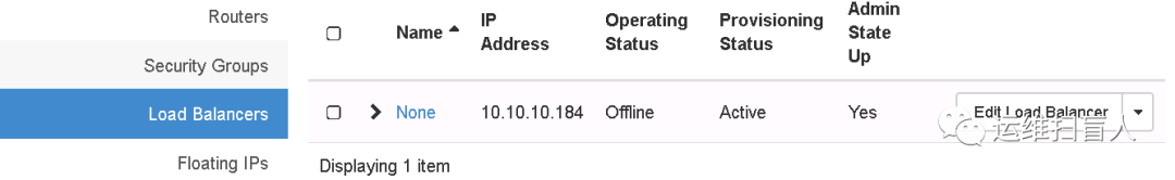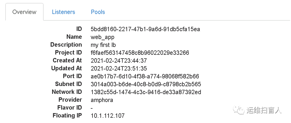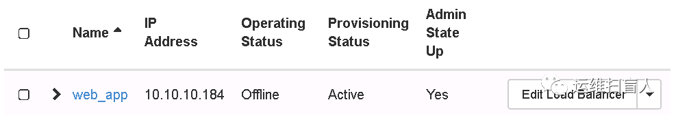 root@controller-01:~# openstack loadbalancer list+--------------------------------------+---------+----------------------------------+--------------+---------------------+----------+| id | name | project_id | vip_address | provisioning_status | provider |+--------------------------------------+---------+----------------------------------+--------------+---------------------+----------+| 5bdd8160-2217-47b1-9a6d-91db5cfa15ea | web_app | f6faef563147458c8b96022029e33266 | 10.10.10.184 | ACTIVE | amphora |+--------------------------------------+---------+----------------------------------+--------------+---------------------+----------+