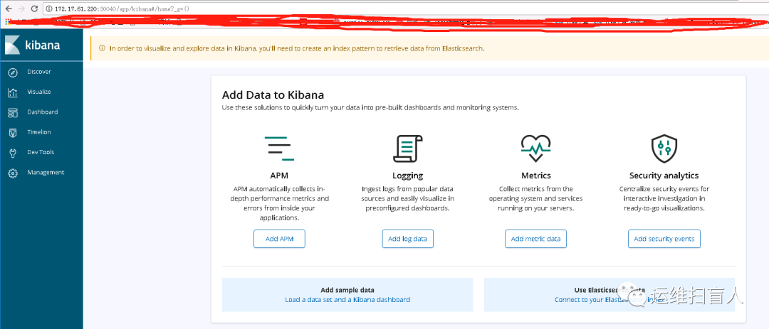 [root@k8s-master-01 kibana]# helm install --name kibana1 stable/kibana -f values.yamlWARNING: This chart is deprecatedNAME: kibana1LAST DEPLOYED: Tue Dec 1 22:24:36 2020NAMESPACE: defaultSTATUS: DEPLOYEDRESOURCES:==> v1/ConfigMapNAME DATA AGEkibana1 1 0skibana1-test 1 0s==> v1/DeploymentNAME READY UP-TO-DATE AVAILABLE AGEkibana1 0/1 1 0 0s==> v1/Pod(related)NAME READY STATUS RESTARTS AGEkibana1-59c97665-x8v7f 0/1 ContainerCreating 0 0s==> v1/ServiceNAME TYPE CLUSTER-IP EXTERNAL-IP PORT(S) AGEkibana1 NodePort 10.101.81.121 <none> 443:30040/TCP 0sNOTES:THE CHART HAS BEEN DEPRECATED!Find the new official version @ https://github.com/elastic/helm-charts/tree/master/kibanaTo verify that kibana1 has started, run:kubectl --namespace=default get pods -l "app=kibana"Kibana can be accessed:* From outside the cluster, run these commands in the same shell:export NODE_PORT=$(kubectl get --namespace default -o jsonpath="{.spec.ports[0].nodePort}" services kibana1)export NODE_IP=$(kubectl get nodes --namespace default -o jsonpath="{.items[0].status.addresses[0].address}")echo http://$NODE_IP:$NODE_PORT[root@k8s-master-01 kibana]# export NODE_PORT=$(kubectl get --namespace default -o jsonpath="{.spec.ports[0].nodePort}" services kibana1)[root@k8s-master-01 kibana]# export NODE_IP=$(kubectl get nodes --namespace default -o jsonpath="{.items[0].status.addresses[0].address}")[root@k8s-master-01 kibana]# echo http://$NODE_IP:$NODE_PORThttp://172.17.61.220:30040