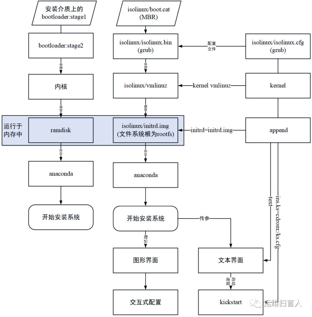 stage1:MBR:isolinux/boot.cat -->grubstage2:isolinux/isolinux.bin -->提供安装菜单界面配置文件:isolinux/isolinux.cfg每选择一个选项就执行对应操作:label linuxmenu label ^Install or upgrade an existing systemmenu defaultkernel vmlinuzappend initrd=initrd.imgisolinuxvmlinuzisolinuxinitrd.img结论:isolinux相当于系统的boot分区