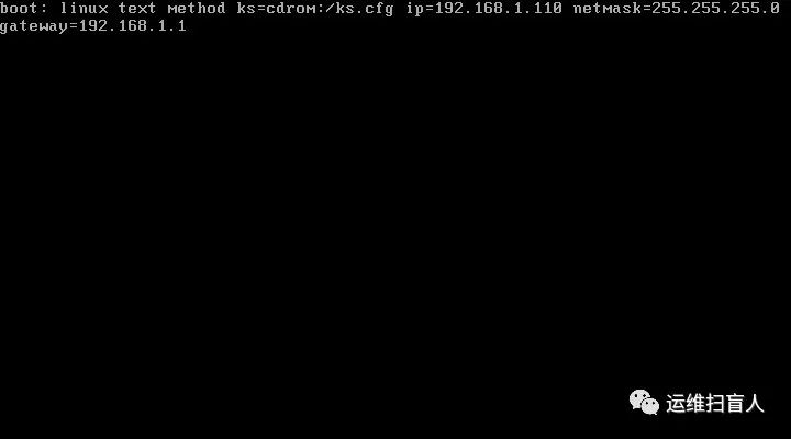 boot:linux text method ip=192.168.3.140 netmask=255.255.255.0 gateway=192.168.3.1 ks=http://192.168.3.100:80/ks.cfg