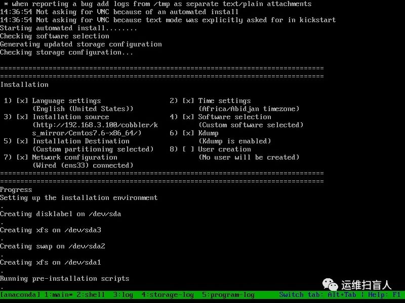 [root@localhost ~]# mount /dev/cdrom /mnt/-->从光驱导入ISO文件[root@localhost ~]# cobbler image --help-->获取cobbler子命令帮助usage=====cobbler image addcobbler image copycobbler image editcobbler image findcobbler image listcobbler image removecobbler image renamecobbler image report[root@localhost ~]# cobbler import --path=/mnt/ --name=CentOS-7-x86_64 --arch=x86_64task started: 2019-12-06_031204_importtask started (id=Media import, time=Fri Dec 6 03:12:04 2019)Found a candidate signature: breed=redhat, version=rhel6Found a matching signature: breed=redhat, version=rhel6Adding distros from path /var/www/cobbler/ks_mirror/CentOS-7-x86_64:creating new distro: CentOS-7-x86_64trying symlink: /var/www/cobbler/ks_mirror/CentOS-7-x86_64 -> /var/www/cobbler/links/CentOS-7-x86_64creating new profile: CentOS-7-x86_64associating reposchecking for rsync repo(s)checking for rhn repo(s)checking for yum repo(s)starting descent into /var/www/cobbler/ks_mirror/CentOS-7-x86_64 for CentOS-7-x86_64processing repo at : /var/www/cobbler/ks_mirror/CentOS-7-x86_64need to process repo/comps: /var/www/cobbler/ks_mirror/CentOS-7-x86_64looking for /var/www/cobbler/ks_mirror/CentOS-7-x86_64/repodata/*comps*.xmlKeeping repodata as-is :/var/www/cobbler/ks_mirror/CentOS-7-x86_64/repodata*** TASK COMPLETE ***[root@localhost ~]# ll /var/www/cobbler/ks_mirror/total 0drwxrwxr-x 8 root root 254 Nov 25 2018 CentOS-7-x86_64drwxr-xr-x 2 root root 34 Dec 6 03:15 config[root@localhost ~]# cobbler distro reportName : CentOS-7-x86_64Architecture : x86_64TFTP Boot Files : {}Breed : redhatComment :Fetchable Files : {}Initrd : /var/www/cobbler/ks_mirror/CentOS-7-x86_64/images/pxeboot/initrd.imgKernel : /var/www/cobbler/ks_mirror/CentOS-7-x86_64/images/pxeboot/vmlinuzKernel Options : {}Kernel Options (Post Install) : {}Kickstart Metadata : {'tree': 'http://@@http_server@@/cblr/links/CentOS-7-x86_64'}Management Classes : []OS Version : rhel6Owners : ['admin']Red Hat Management Key : <<inherit>>Red Hat Management Server : <<inherit>>Template Files[root@localhost ~]# cobbler profile reportName : CentOS-7-x86_64TFTP Boot Files : {}Comment :DHCP Tag : defaultDistribution : CentOS-7-x86_64Enable gPXE? : 0Enable PXE Menu? : 1Fetchable Files : {}Kernel Options : {}Kernel Options (Post Install) : {}Kickstart : /var/lib/cobbler/kickstarts/sample_end.ksKickstart Metadata : {}Management Classes : []Management Parameters : <<inherit>>Name Servers : []Name Servers Search Path : []Owners : ['admin']Parent Profile :Internal proxy :Red Hat Management Key : <<inherit>>Red Hat Management Server : <<inherit>>Repos : []Server Override : <<inherit>>Template Files : {}Virt Auto Boot : 1Virt Bridge : xenbr0Virt CPUs : 1Virt Disk Driver Type : rawVirt File Size(GB) : 5Virt Path :Virt RAM (MB) : 512Virt Type : kvm导入ISO后会默认生成ks文件/var/lib/cobbler/kickstarts/sample_end.ks,cobbler到现在已经可以实现自动化安装了,不过我们需要自定义ks文件