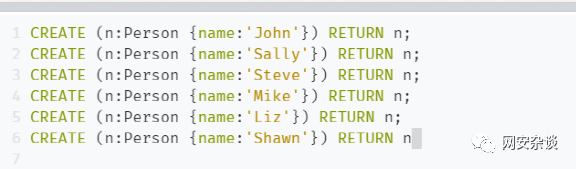 CREATE (n:Person {name:'Sally'}) RETURN nCREATE (n:Person {name:'Steve'}) RETURN nCREATE (n:Person {name:'Mike'}) RETURN nCREATE (n:Person {name:'Liz'}) RETURN nCREATE (n:Person {name:'Shawn'}) RETURN n