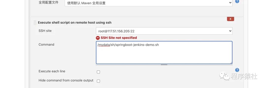 配置执行远程脚本shell的构建,用于在我们的镜像打包完成后执行docker容器