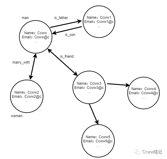 每两个数据节点之间关系数据,如Ccww与Ccww1的用户是父子关系。利用这些关系数据,你就可以方便的作出基于关系的查询,这就是图数据库的优势。
