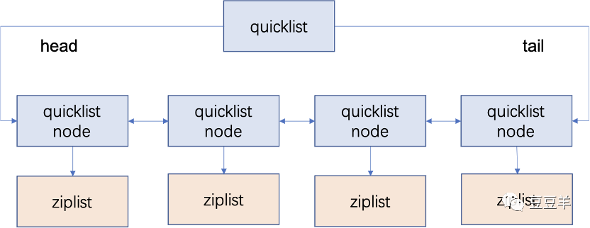观察上面输出字段encoding的值,quicklist是ziplist和linkedlist的混合体,它将linkedlist按段切分,每一段使用ziplist来紧凑存储,多个ziplist之间使用双向指针串接起来。