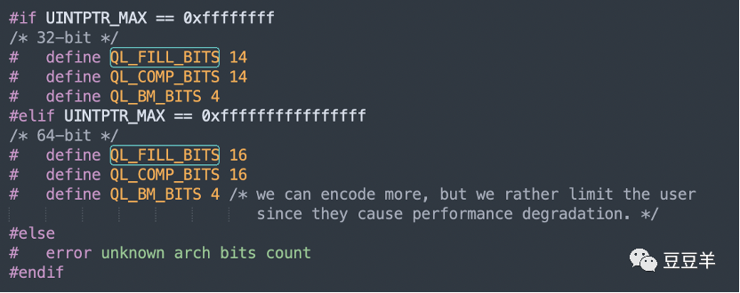 #if UINTPTR_MAX == 0xffffffff /* 32-bit */ # define QL_FILL_BITS 14 # define QL_COMP_BITS 14 # define QL_BM_BITS 4 #elif UINTPTR_MAX == 0xffffffffffffffff /* 64-bit */ # define QL_FILL_BITS 16 # define QL_COMP_BITS 16 # define QL_BM_BITS 4 * we can encode more, but we rather limit the user since they cause performance degradation. */ |